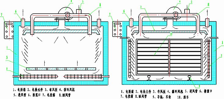 熱風(fēng)循環(huán)方式:根據(jù)所烘產(chǎn)品不同的擺放,選擇擇合理的熱風(fēng)循環(huán)方式,(如下側(cè)鼓風(fēng)單循環(huán)、頂鼓風(fēng)雙循環(huán)、鼓風(fēng)前后大循環(huán)等等;