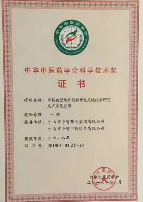 11月25日,中山市中智藥業(yè)集團有限公司申報的“中藥破壁飲片創(chuàng)新開發(fā)關(guān)鍵技術(shù)研究及產(chǎn)業(yè)化應用”項目,榮獲2018年度中華中醫(yī)藥學會科學技術(shù)獎一等獎。